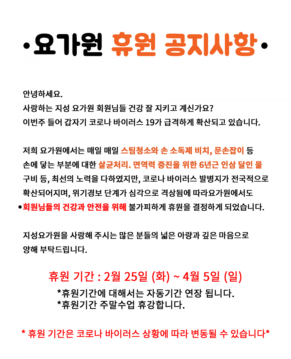 정부 정책으로 인해 요가원 휴원 4월 5일까지 연장합니다.